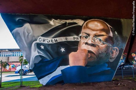 Uma pilastra do viaduto da Av. Marechal Floriano sobre a Linha Verde, em Curitiba, ganhou a imagem do ministro do STF Joaquim Barbosa, homenageado em grafite. É parte do projeto Mural Street of Styles, com apoio do Ministério da Cultura.