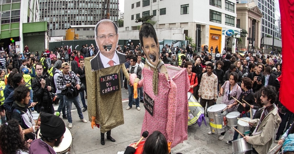 19.jun.2014 - Integrantes do Movimento Passe Livre usaram imagens do prefeito de São Paulo, Fernando Haddad, e do governador do Estado, Geraldo Alckmin, durante uma manifestação na avenida Paulista na tarde desta quinta-feira (19). O movimento relembra o ato ocorrido no ano passado que reverteu a decisão de aumento de 20 centavos na tarifa do transporte público Leia mais Dário Oliveira/Código 19/Estadão Conteúdo